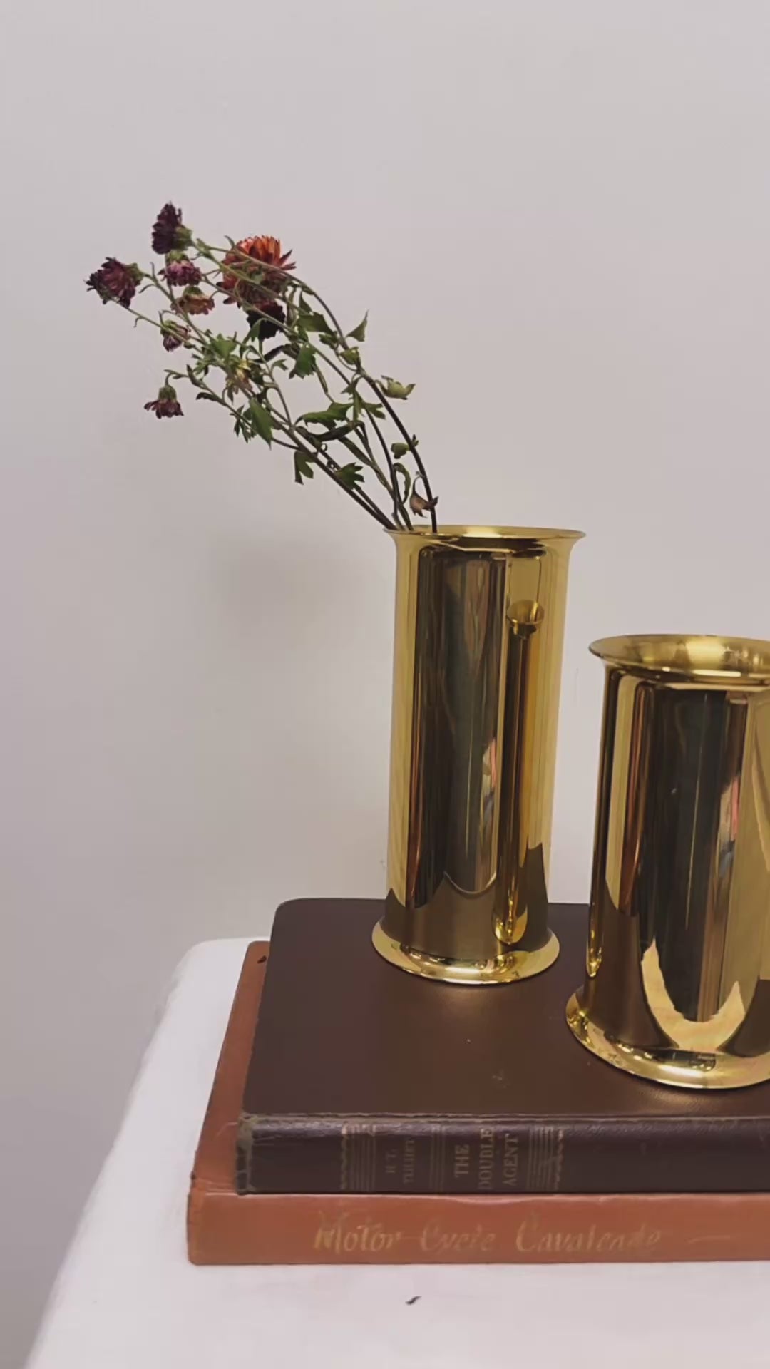 These striking cylindrical brass pieces by Go Products (Denmark, 1970s) bring timeless Scandinavian style to any setting. Use them as minimalist vases or candleholders — their clean lines and warm brass patina make them perfect for vintage or modern decor.