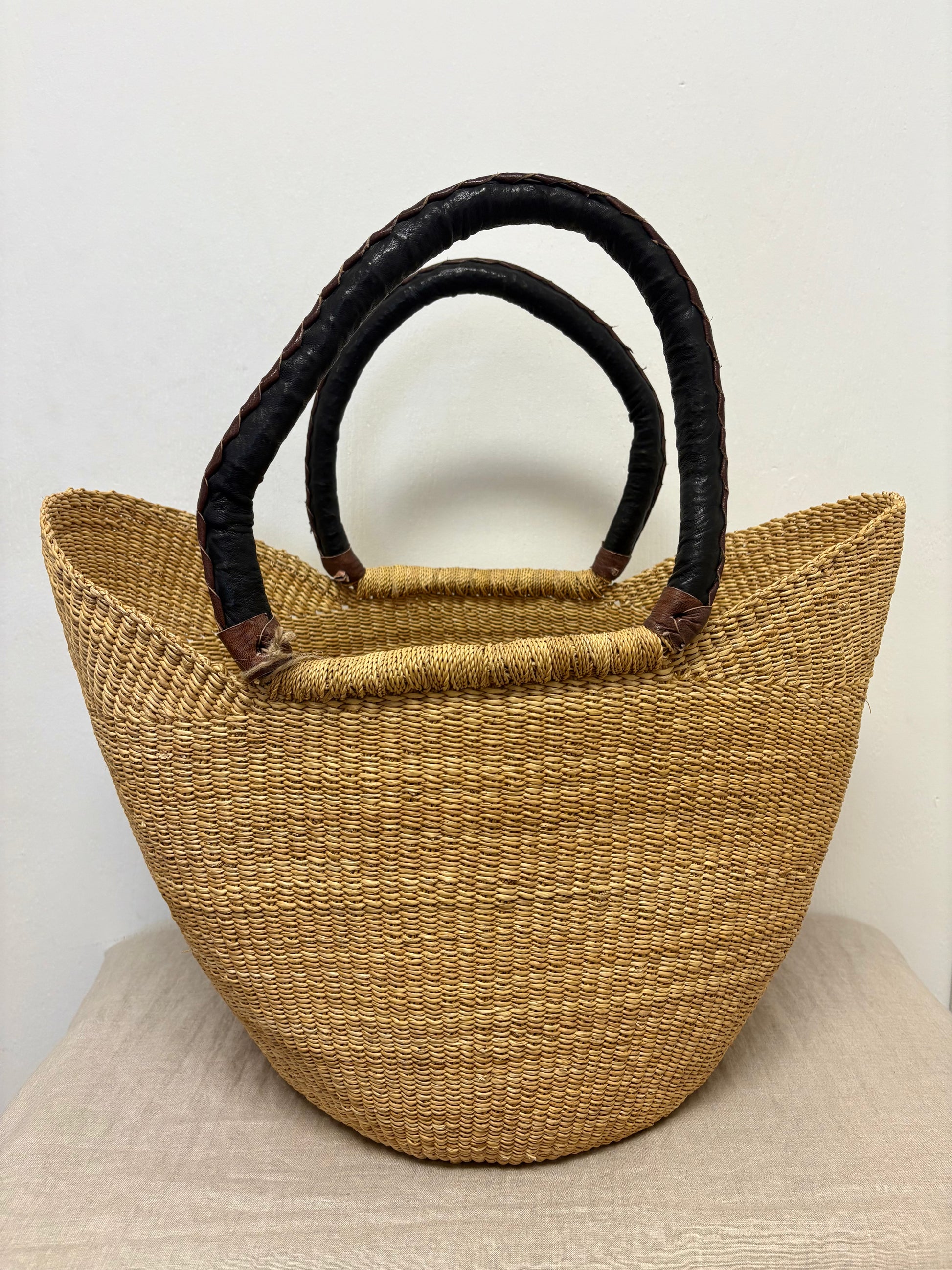 The Anidaso Basket means "Hope" and is your essential market basket , great as an everyday tote, for shopping and heading to the beach. Made of elephant grass and available in all-natural woven design, finished with raw goat leather handles. Note designs may vary in style and color as every single bag is weaved by a different weaver and is one of a kind. Please email us for questions or photos.