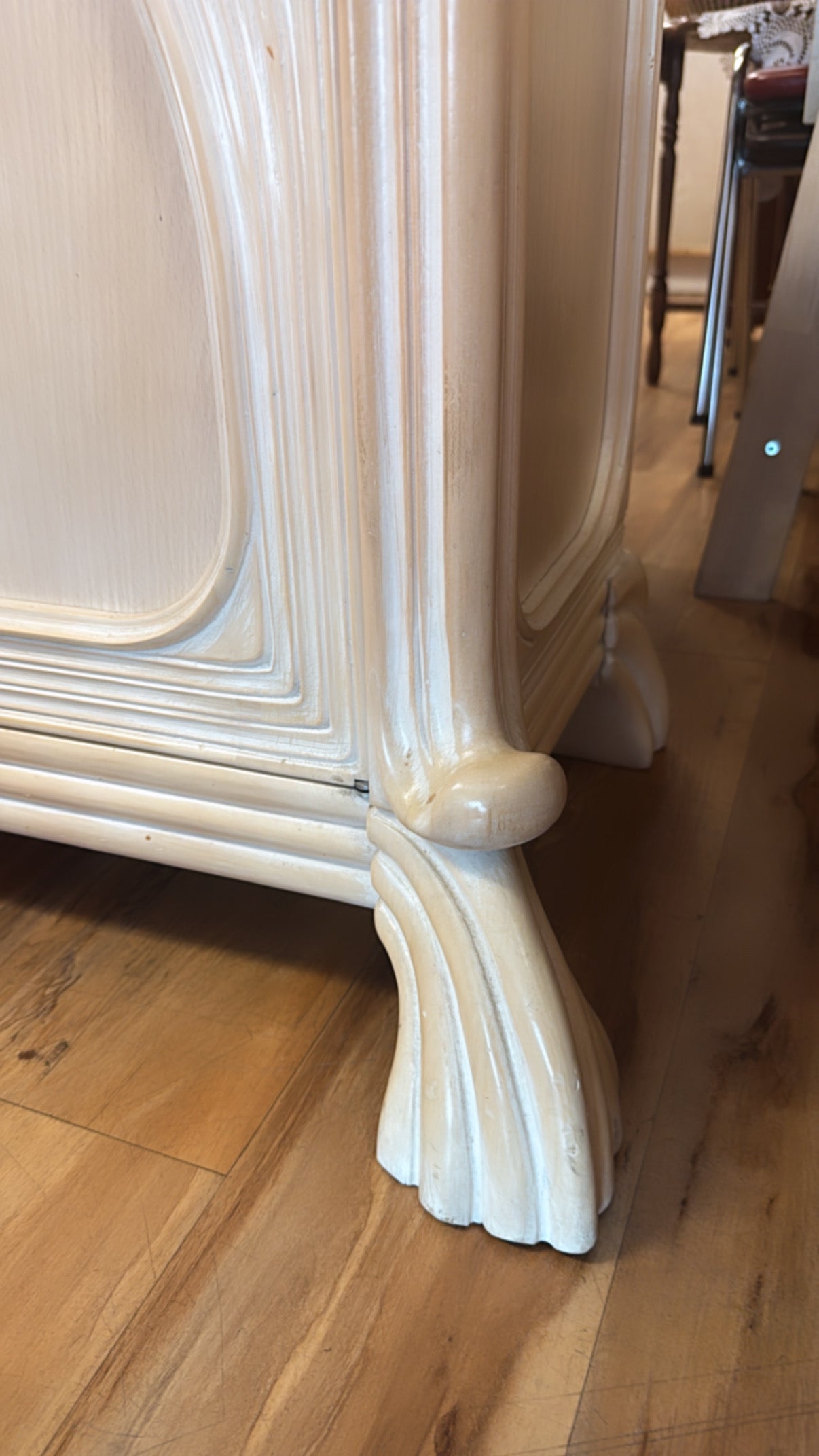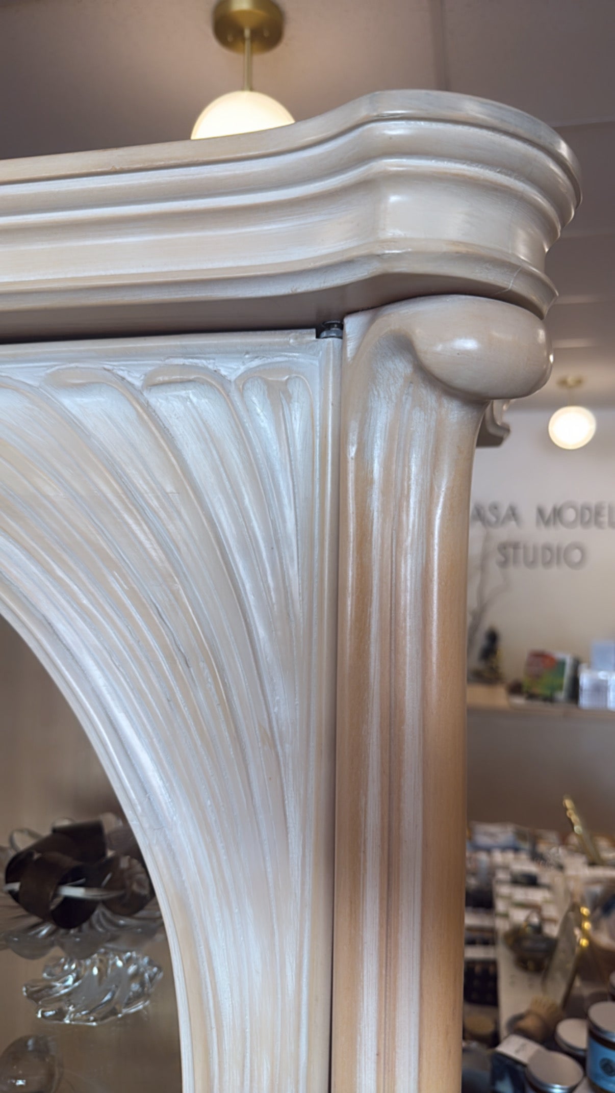 This rare and exquisite vintage curio cabinet is a true showstopper. Crafted in a whitewashed pencil reed style, it features elegantly curved lines, ornate carved details on every corner, and a coastal-inspired design that brings strong Florida beach house vibes.