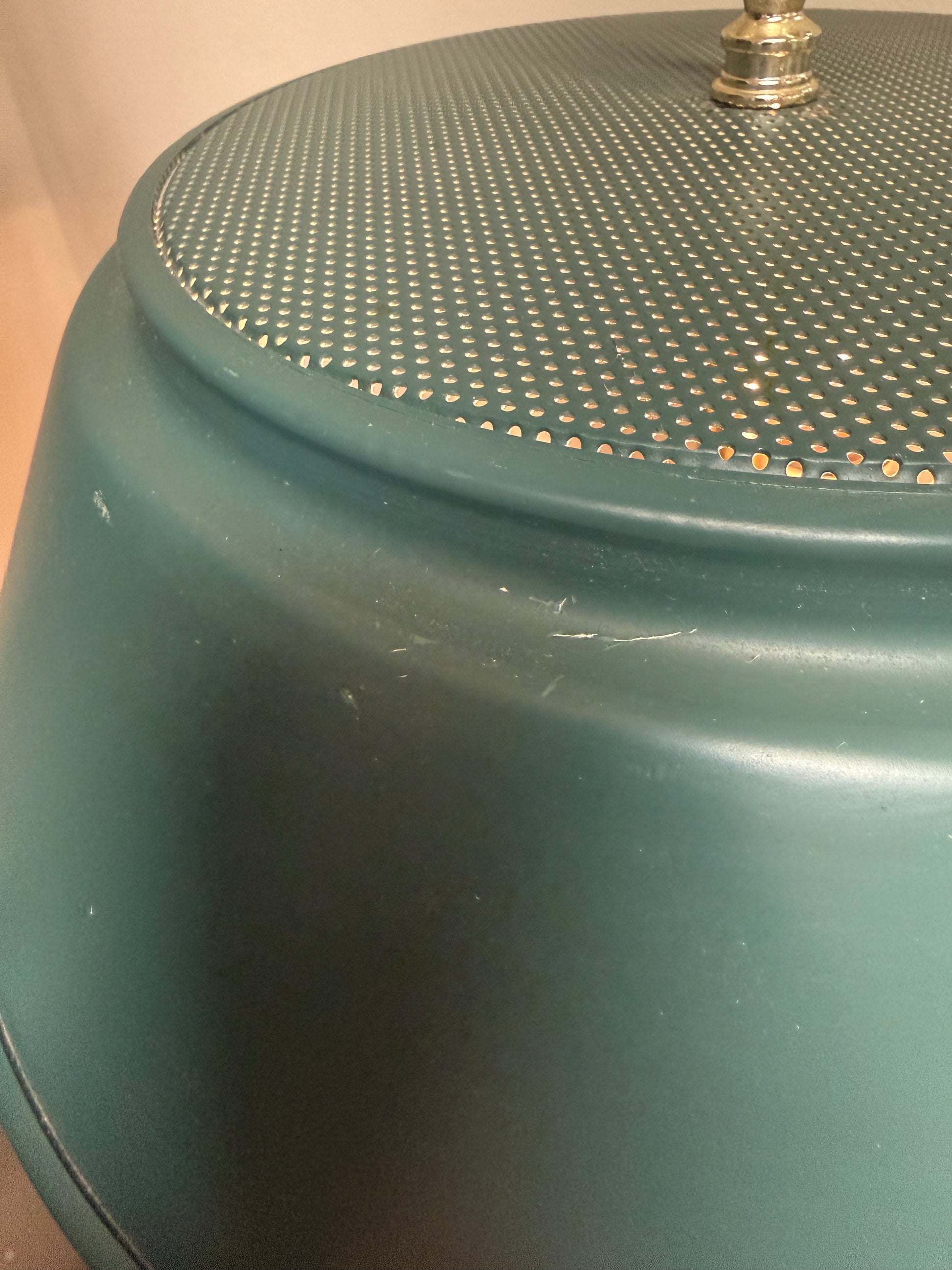 A timeless French-style Bouillotte table lamp, stamped 1995 on the underside and inspired by the elegant salon lamps of 18th-century France. Featuring a rich dark green tole shade and polished brass candlestick-style arms. Tri-light settings, this piece balances classic beauty with quiet functionality. Gentle wear throughout adds depth, character, and authenticity.