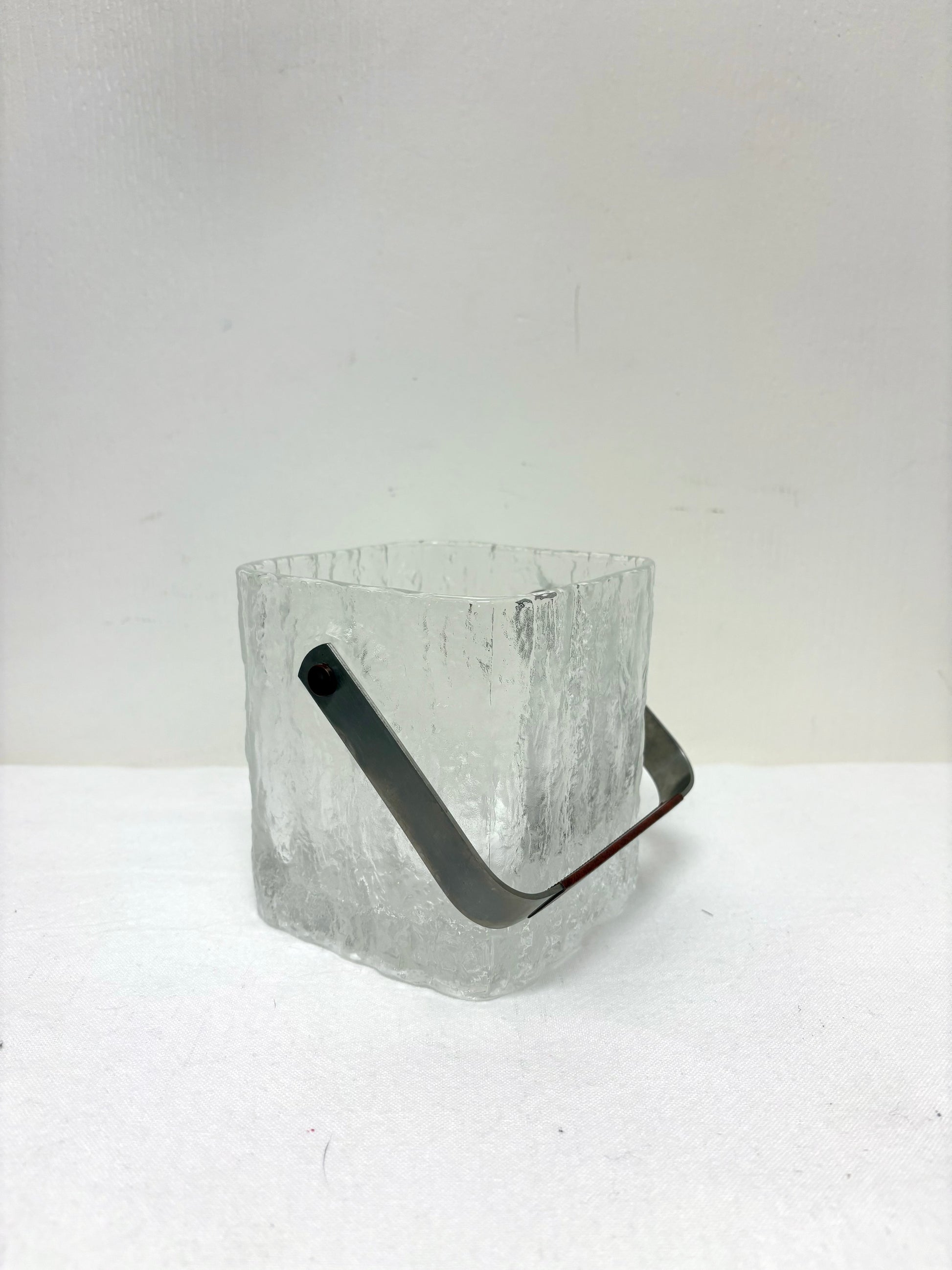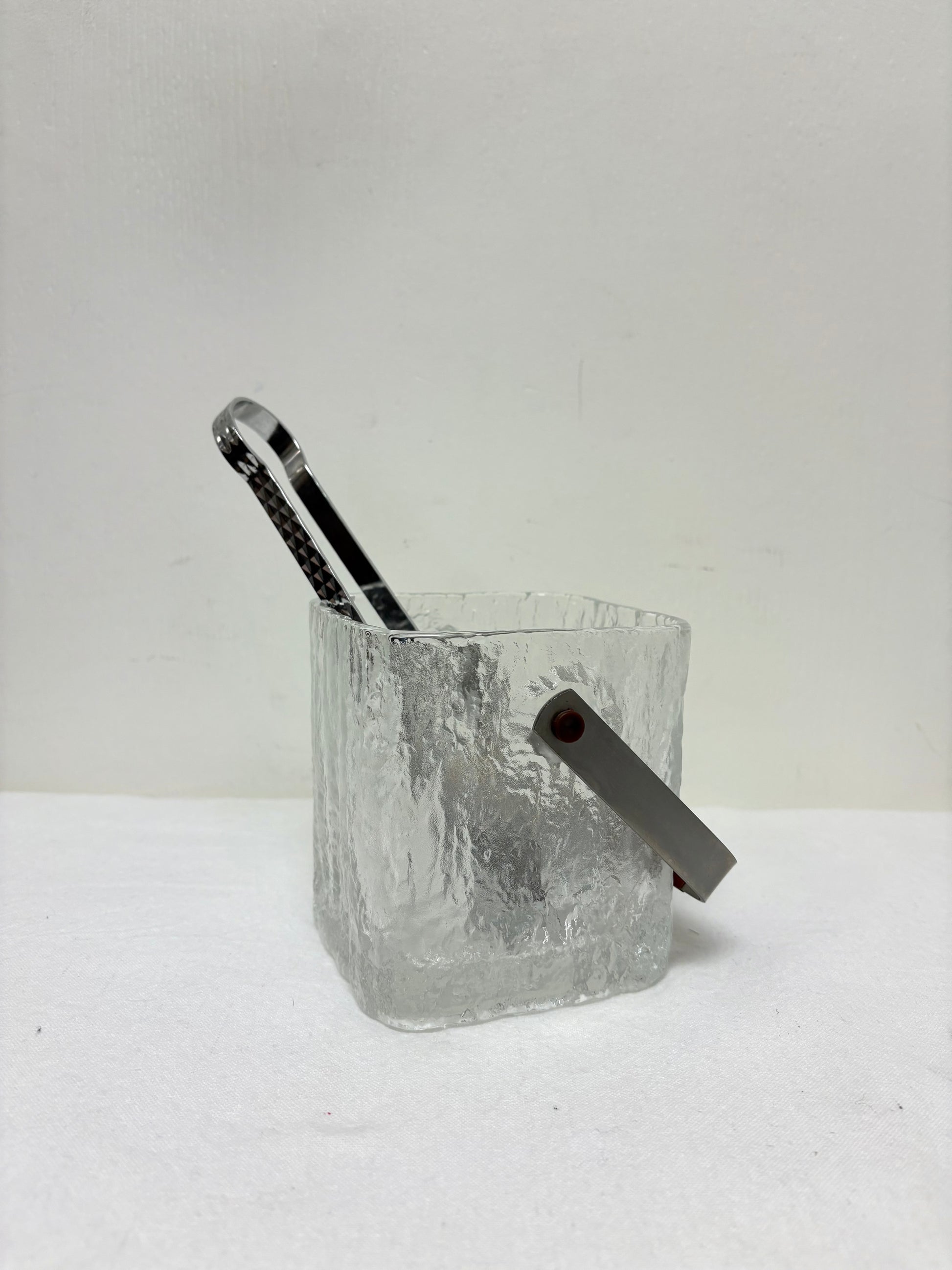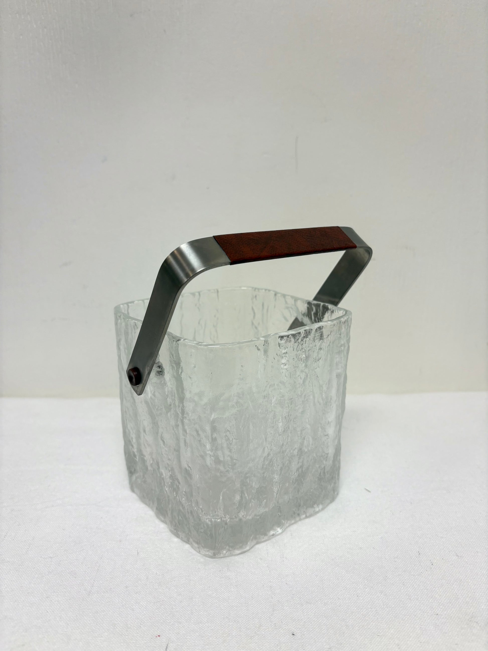 Amaizing Barware Mid Century Modern 1960s Hoya Glacier Ice Bucket. Heavy Ice texture style glass square and chrome/vinyl handle ice bucket made in Japan. Tongs not included.