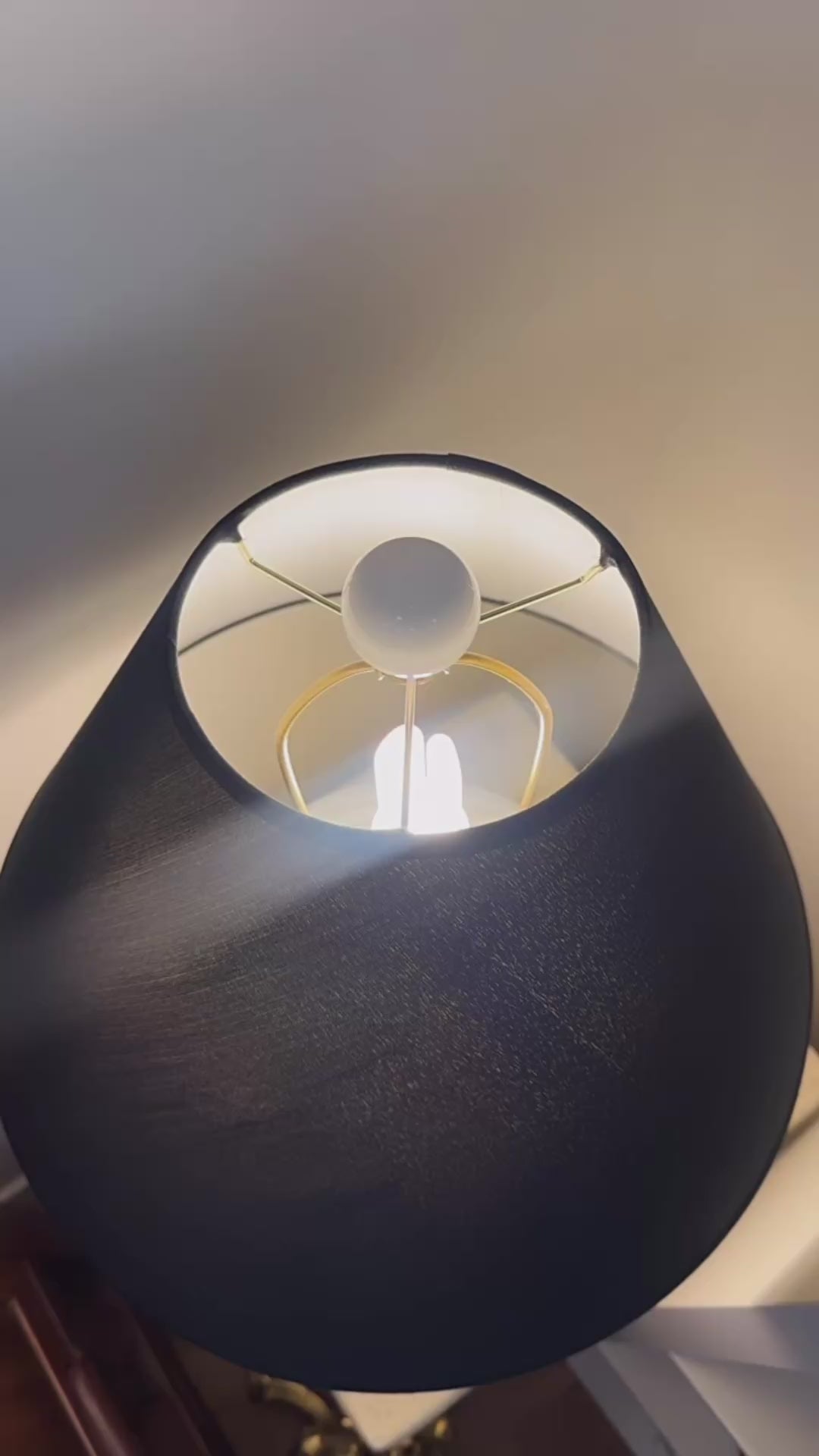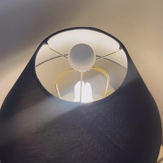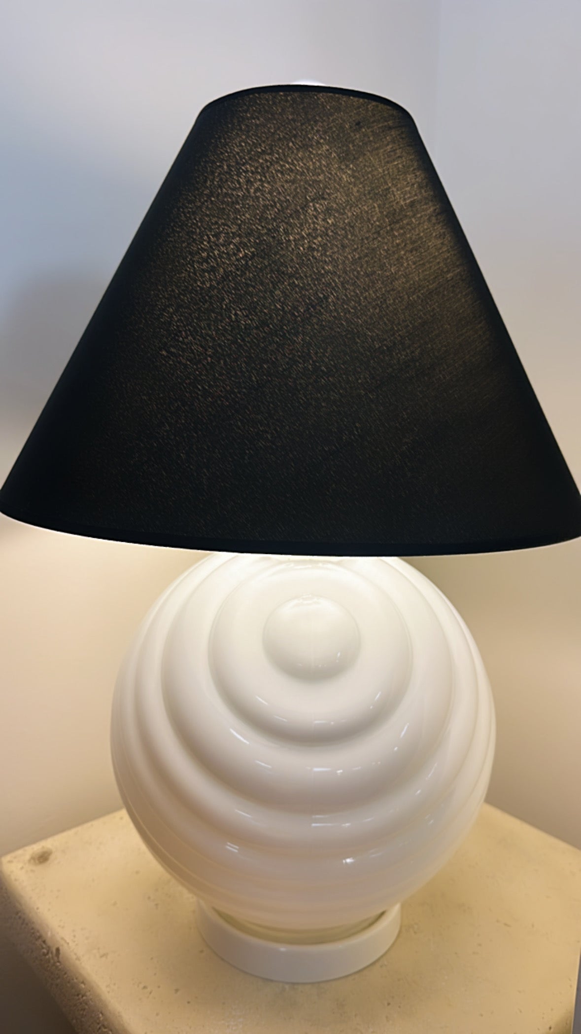 Topped with a linen-style black shade (not original to the lamp), the contrast enhances its visual impact while offering a soft, ambient glow. This lamp is both a functional lighting piece and a bold statement of style—perfect for interiors that appreciate a blend of the past and present.