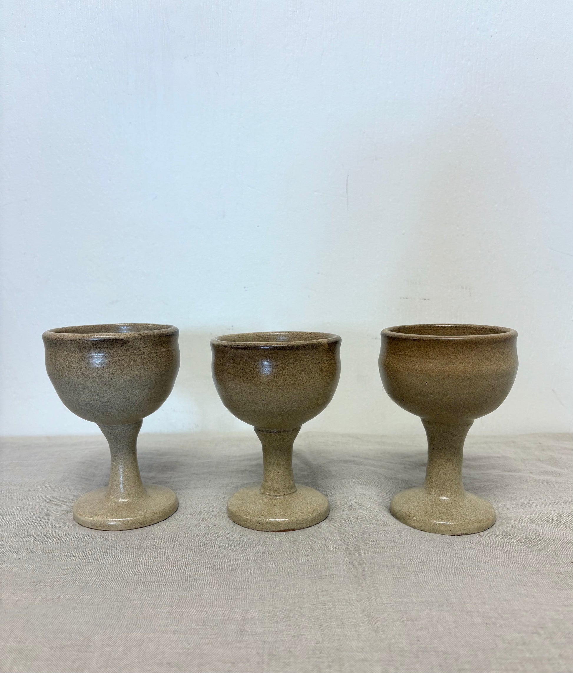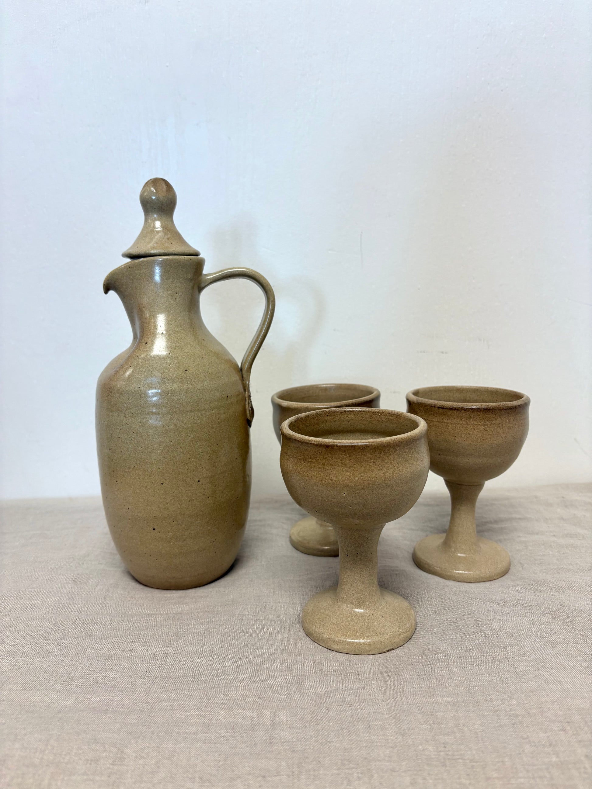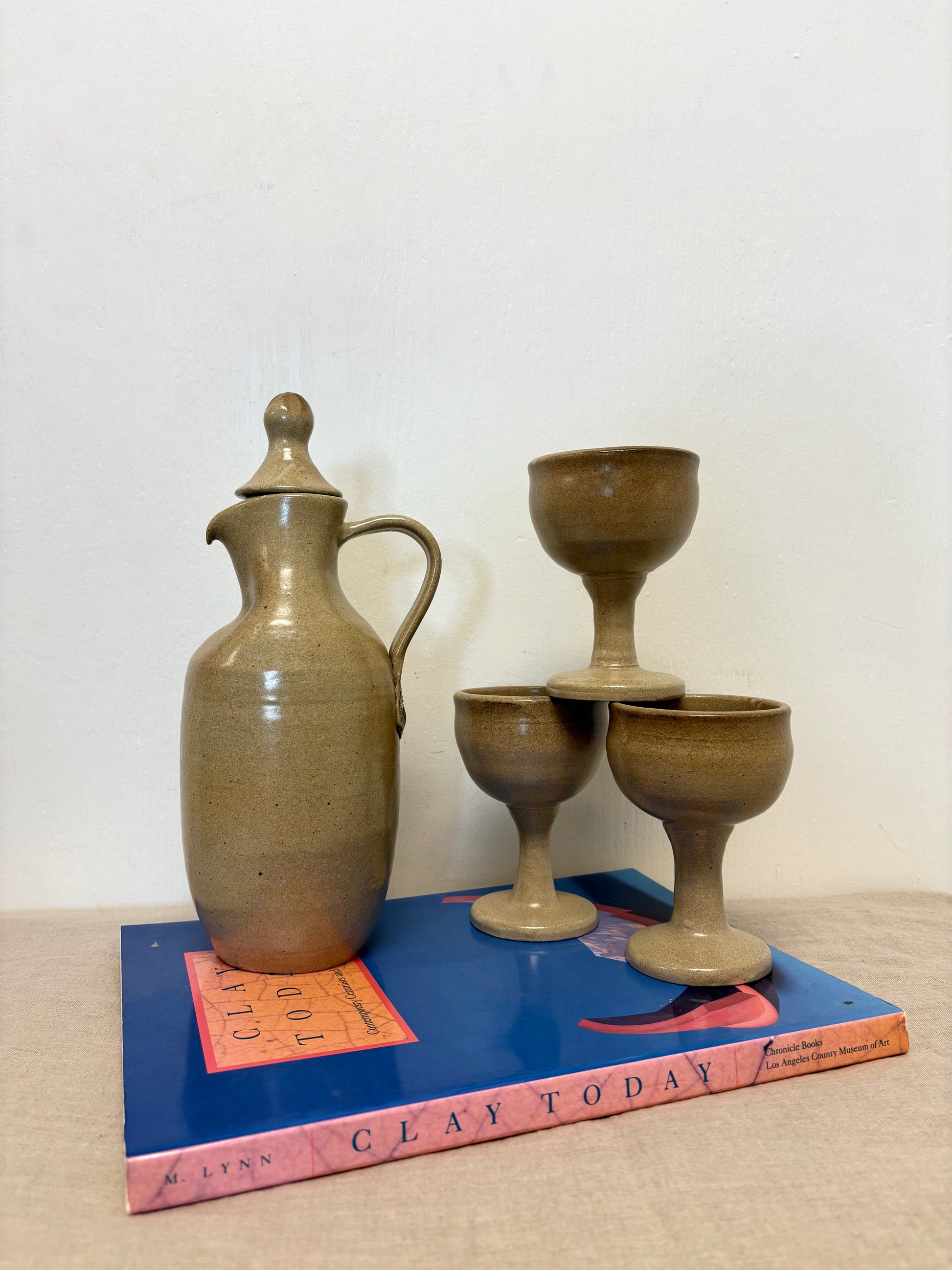 Vintage Handmade Pottery Wine Set, with Pitcher and 3 cups. This beautiful set has the original artist stamp on the bottoms of the pieces.