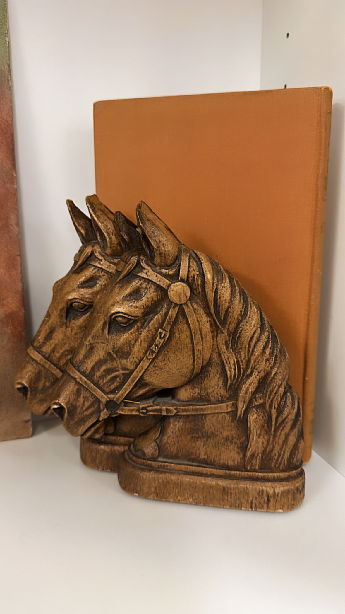 Super cool vintage resin and metal horse bookends. This makes for a unique and fun gift for those horse lovers out there! This pair of bookends are in great vintage condition other than the tip of the ears had previously broken but were painting to matches the rest of the horses ears. It does not affect the functionality of the items and are sold as such. Please view last few photos for reference. Price is for the pair!