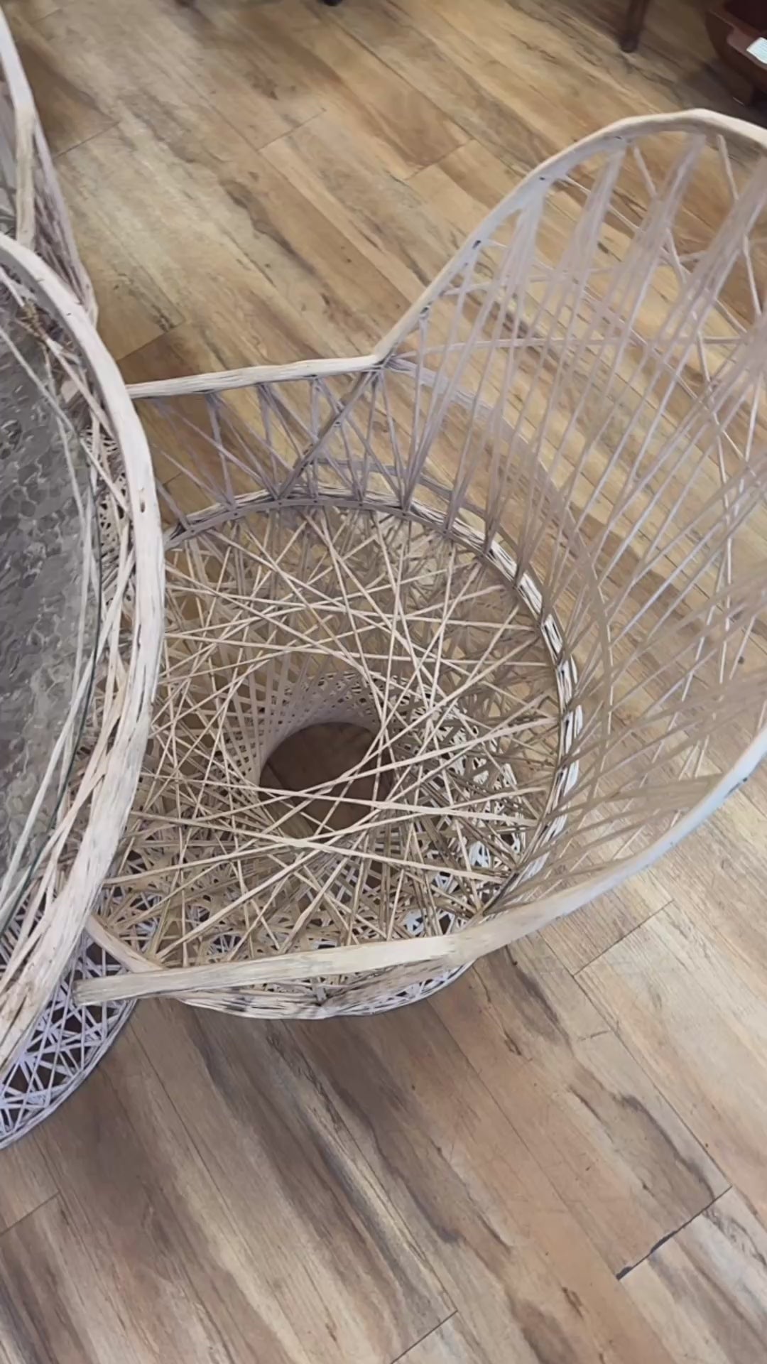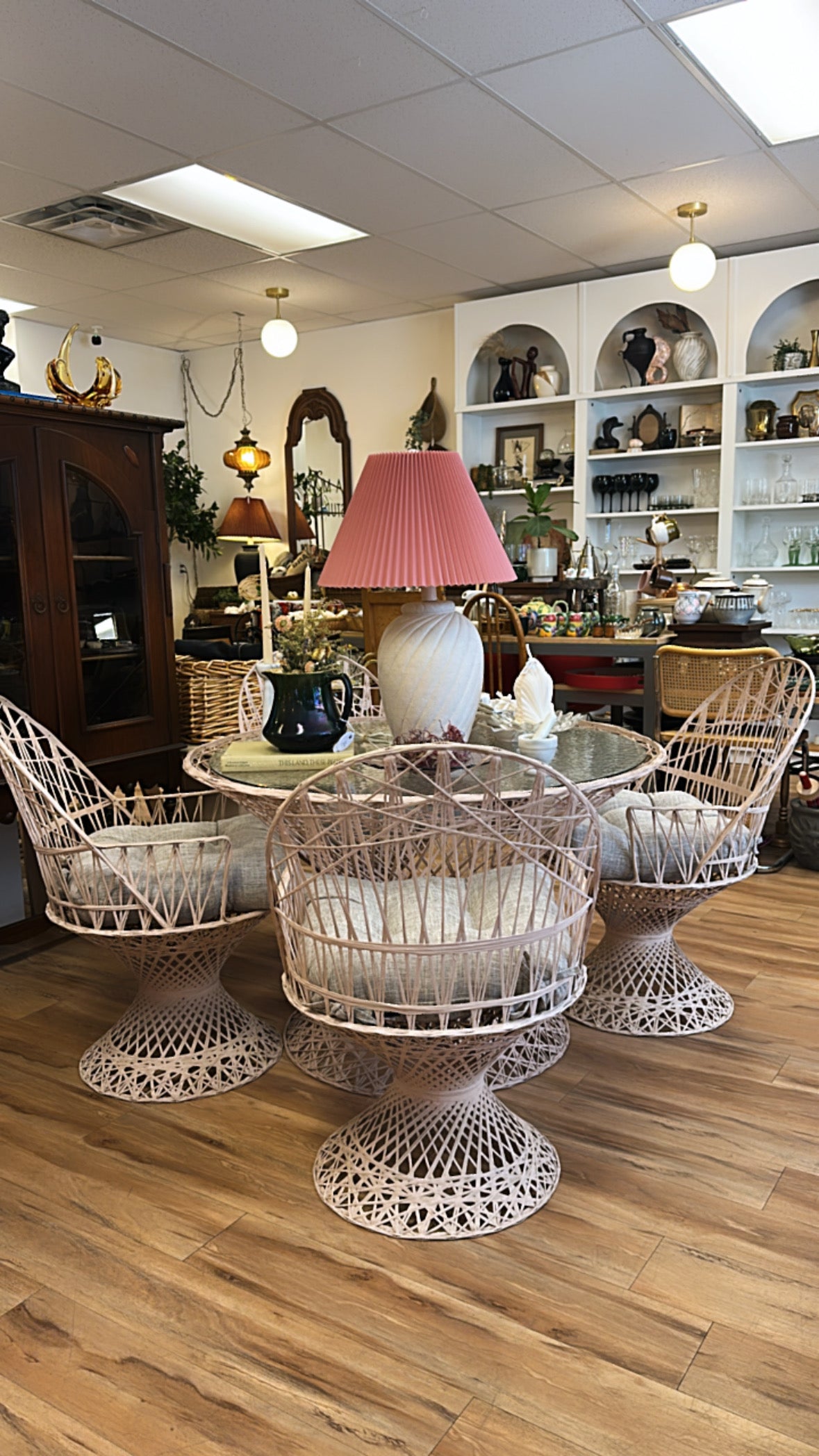 Add retro flair to your indoor or outdoor space with this fabulous atomic-age patio set! This unique ensemble features a light pink spun fiberglass frame—a rare and eye-catching color—paired with a matching glass-top table. The table includes a pre-cut umbrella hole and has a subtle bubble-textured surface for added character.