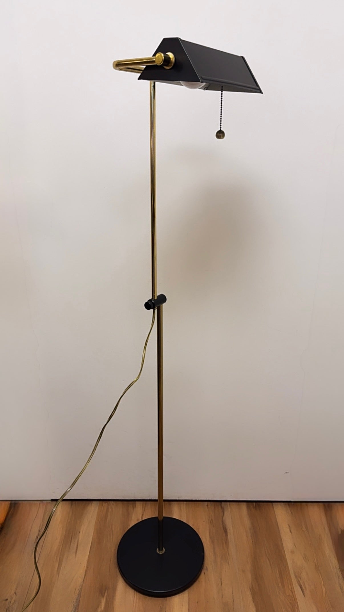 Circa 1960s–1970s a striking blend of Mid-Century Modern function and Hollywood Regency glamour, this adjustable pharmacy floor lamp features a sleek black body paired with warm brass accents. The swivel, pivoting head allows you to direct light exactly where you need it—perfect beside a reading chair, desk, or styled in a sophisticated living space.