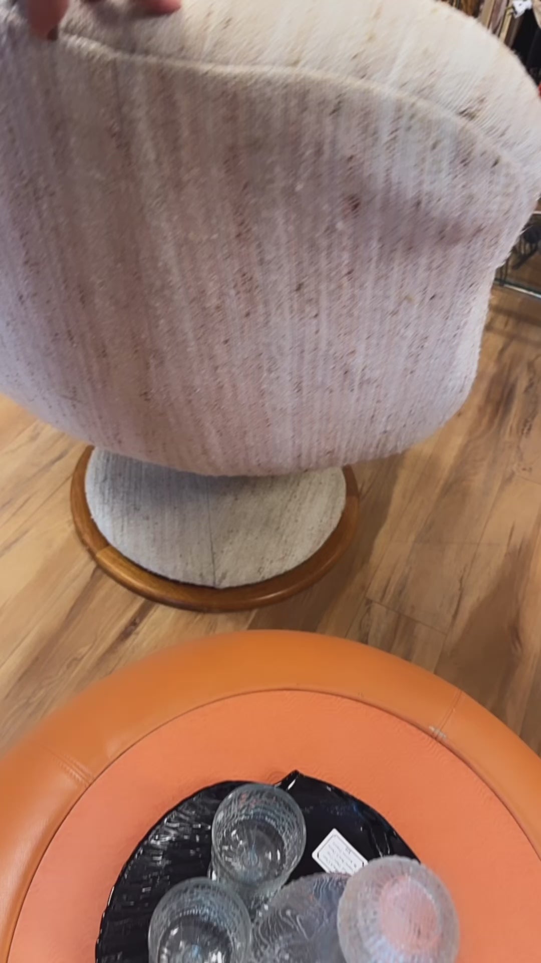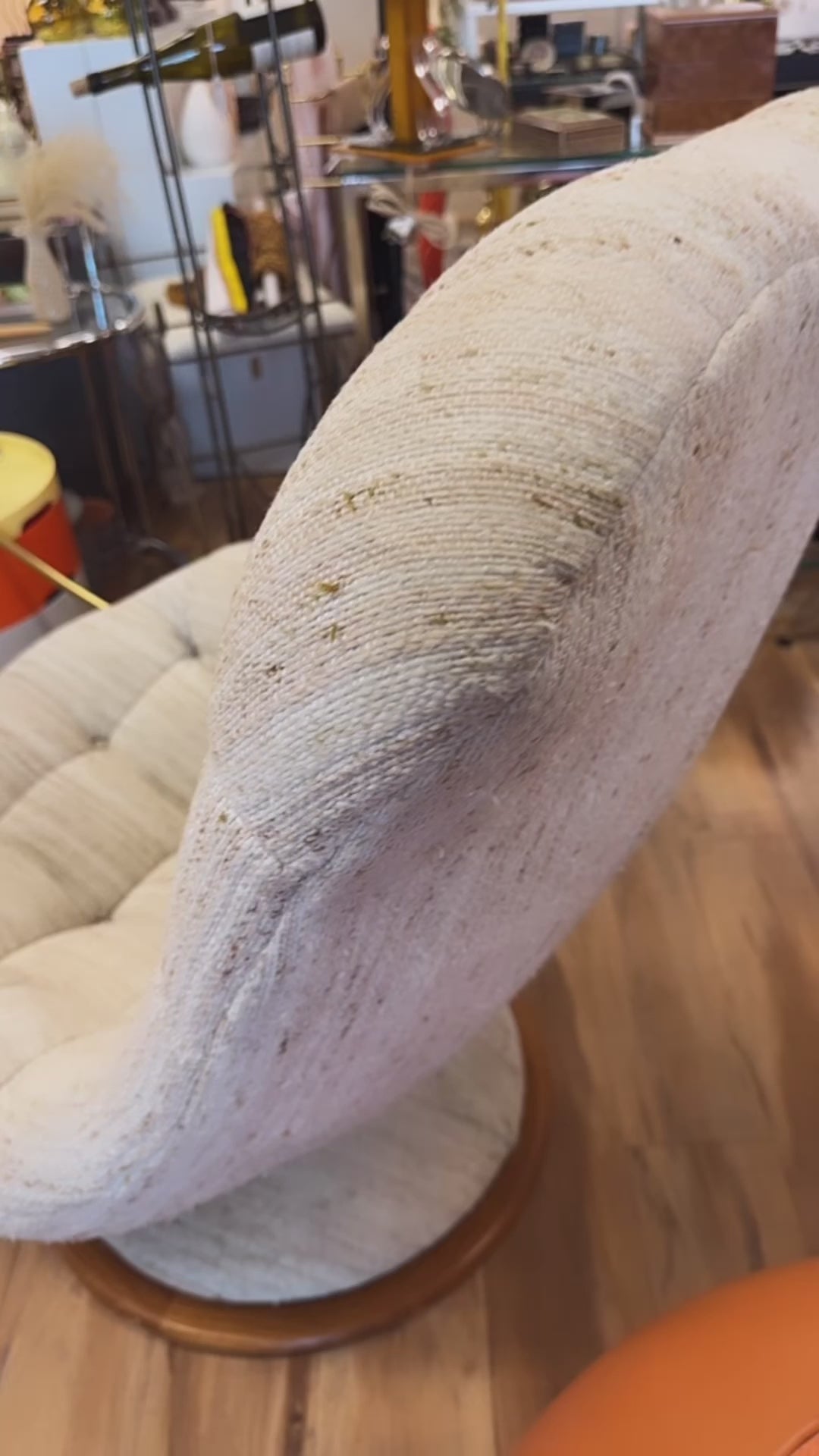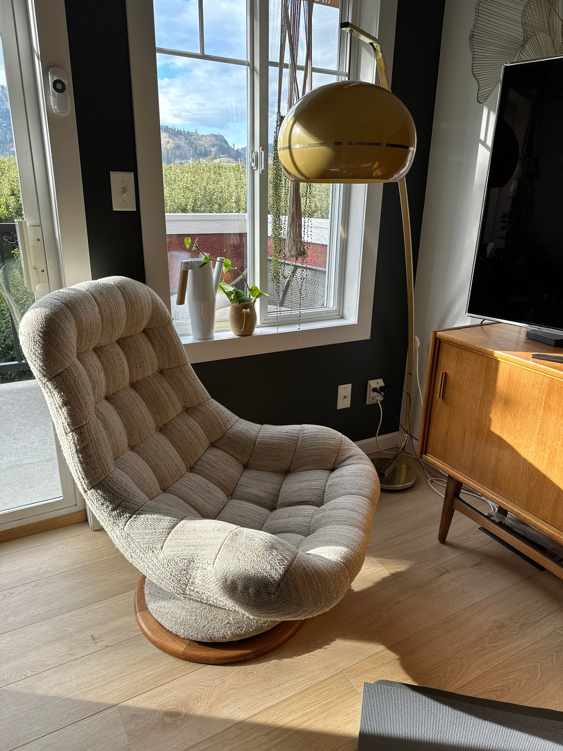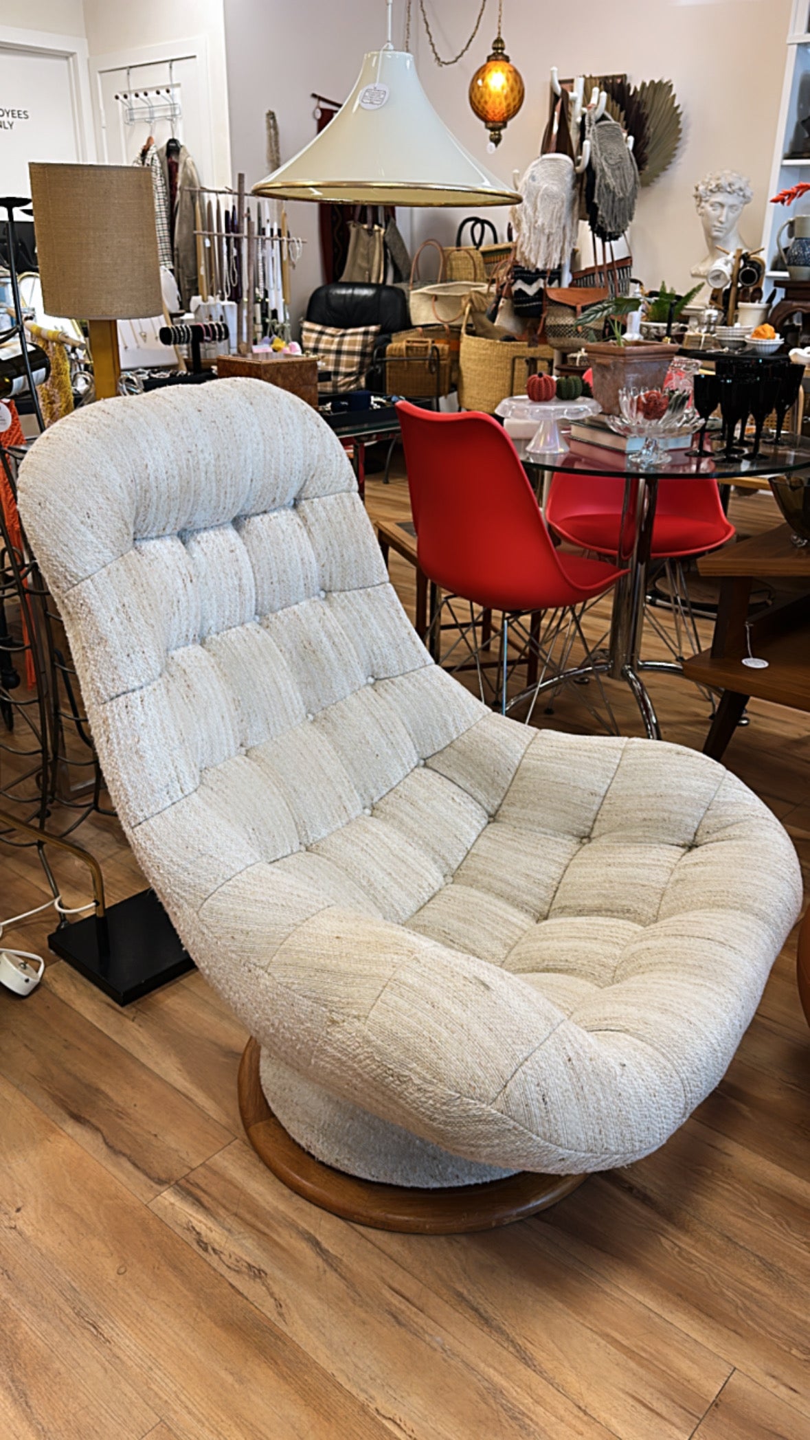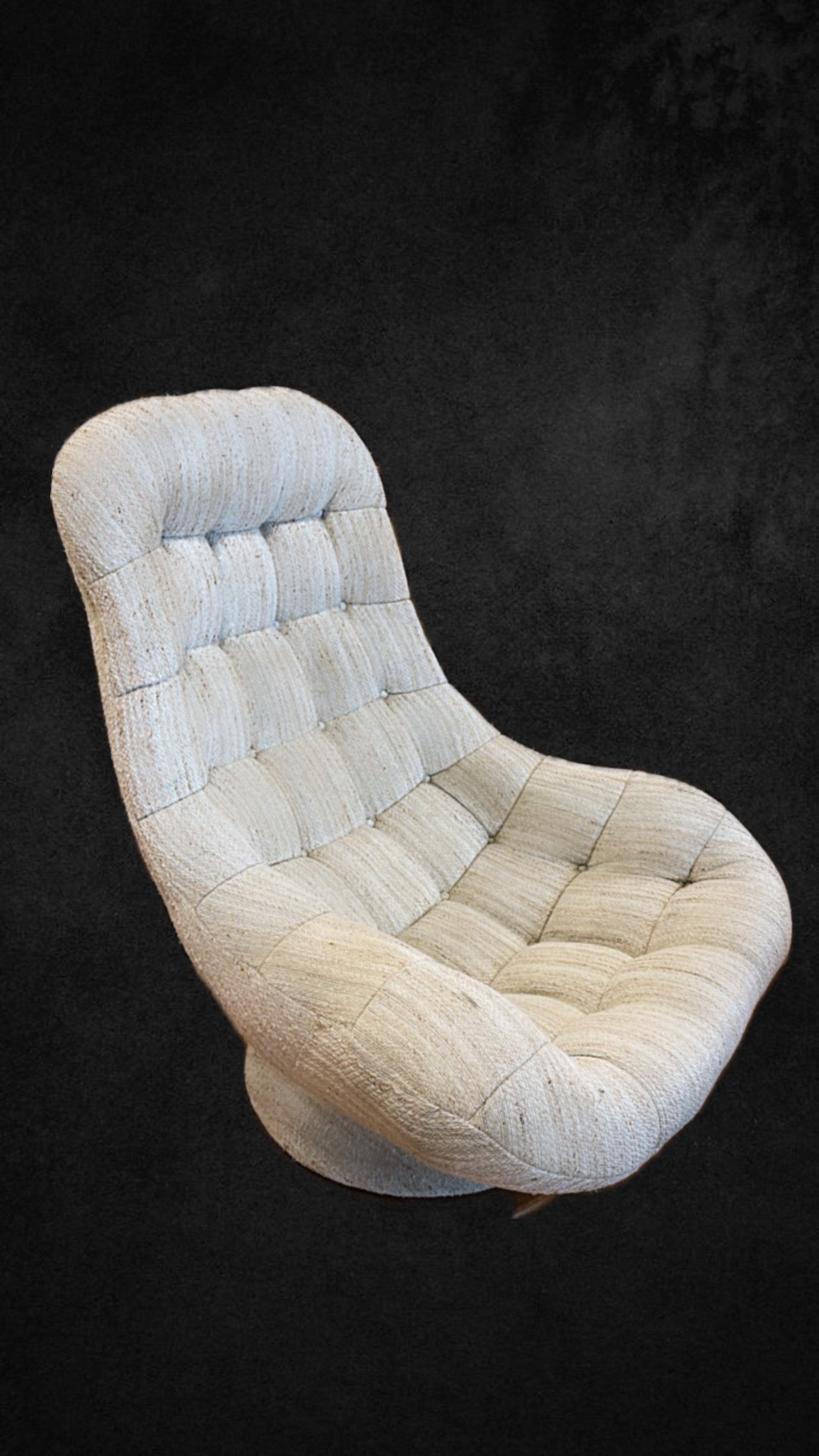 Authentic, trendy & desirable, R Huber Scoop Swivel Chair in classic MCM style, contoured for relaxing body support. Swivels 360 degrees on the round teak base. Button tufting and original beige Linen Upholstery fabric. Swivel mechanism restored and completely replaced for a smooth ride, and a seat made of fibreglass and latex foam, these chairs are both sustainable, durable and well-made Canadian made and a rare find. Originally manufactured in Toronto in the late 60's, this piece is a testament to the exceptional design work being done in Canada during the period, while also showcasing the original influence from Scandinavia.