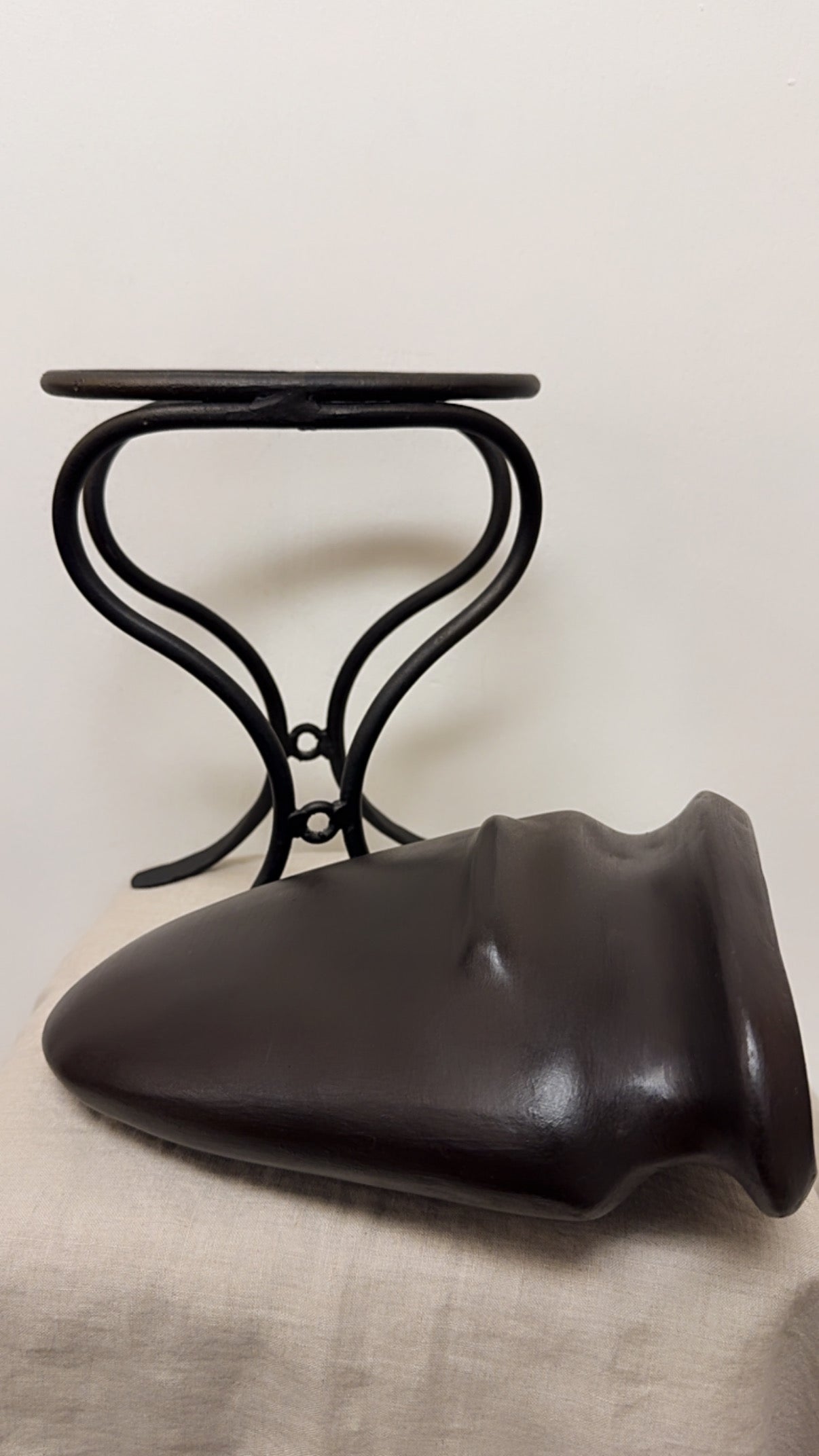 Beautifully repurposed vintage Mexican pottery featuring a unique oval taper silhouette, mounted on a sturdy iron stand. Finished in a rich cacao tone by Casa Modelo Studio, this one-of-a-kind piece blends traditional craftsmanship with modern rustic charm. Perfect as a sculptural accent for shelves, consoles, or tabletop styling.