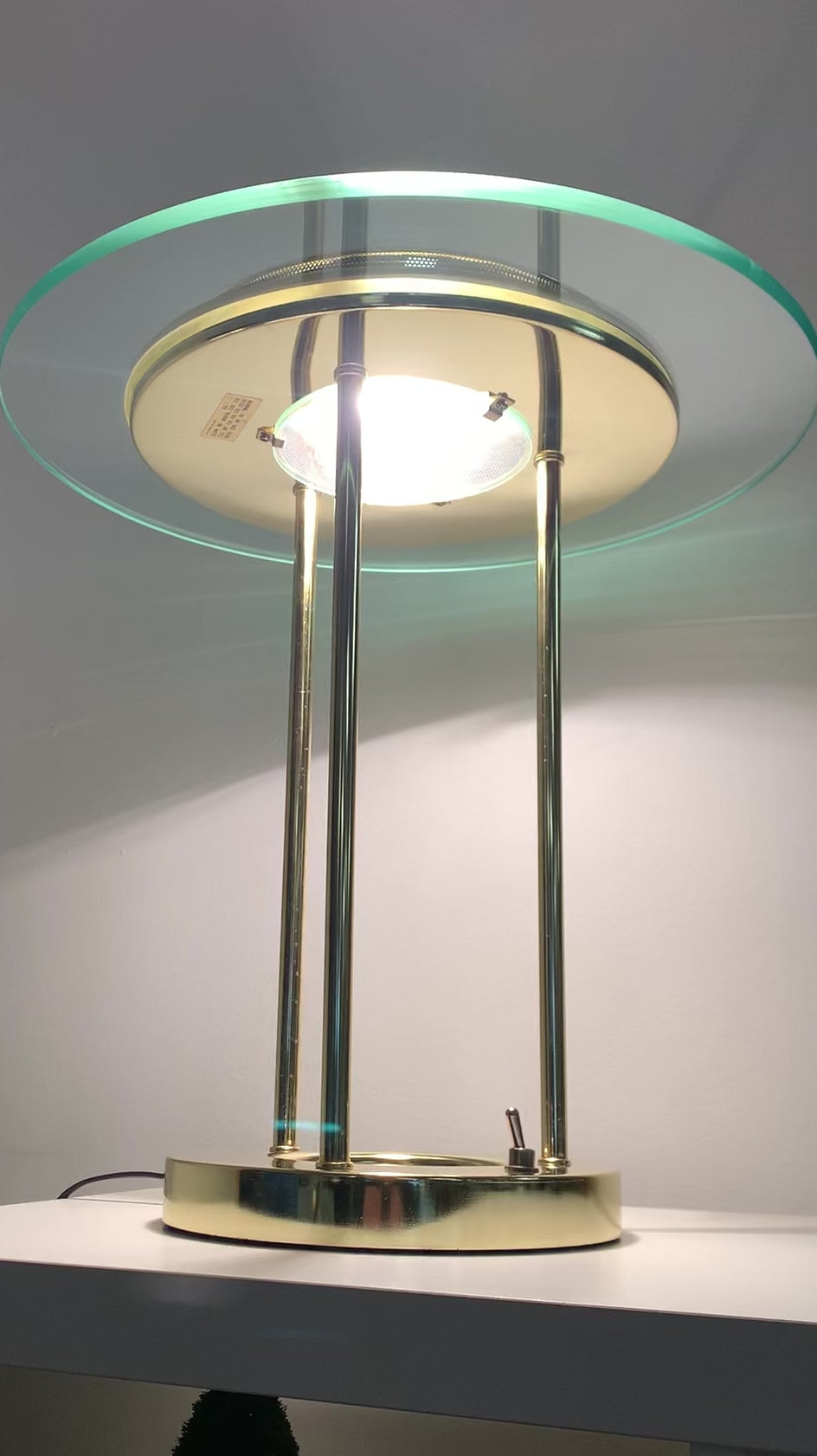 The lamp operates with an integrated dimmer and on/off knob located on the base, allowing for adjustable ambient lighting. Perfect as a statement desk lamp, bedside lamp, or accent piece in a modern or Mid-Century inspired interior. In excellent vintage condition.