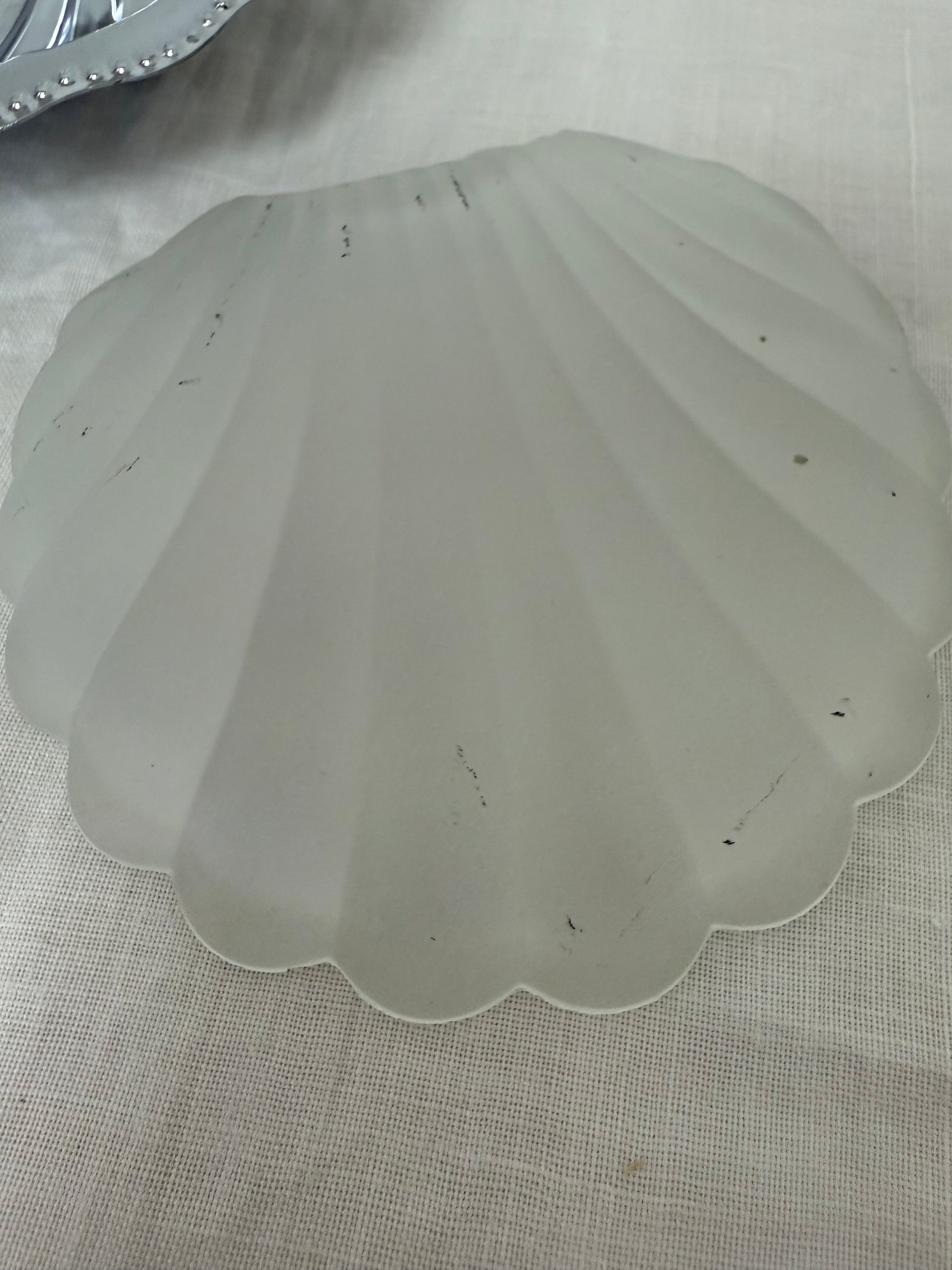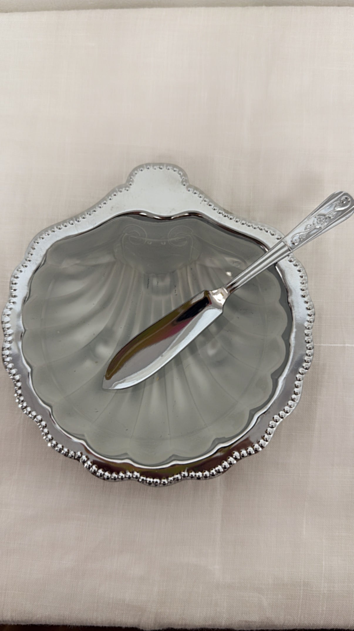 Rare Circa 50s scalloped silver shell butter dish with frosted glass insert for easy washing. Comes with butter knife.