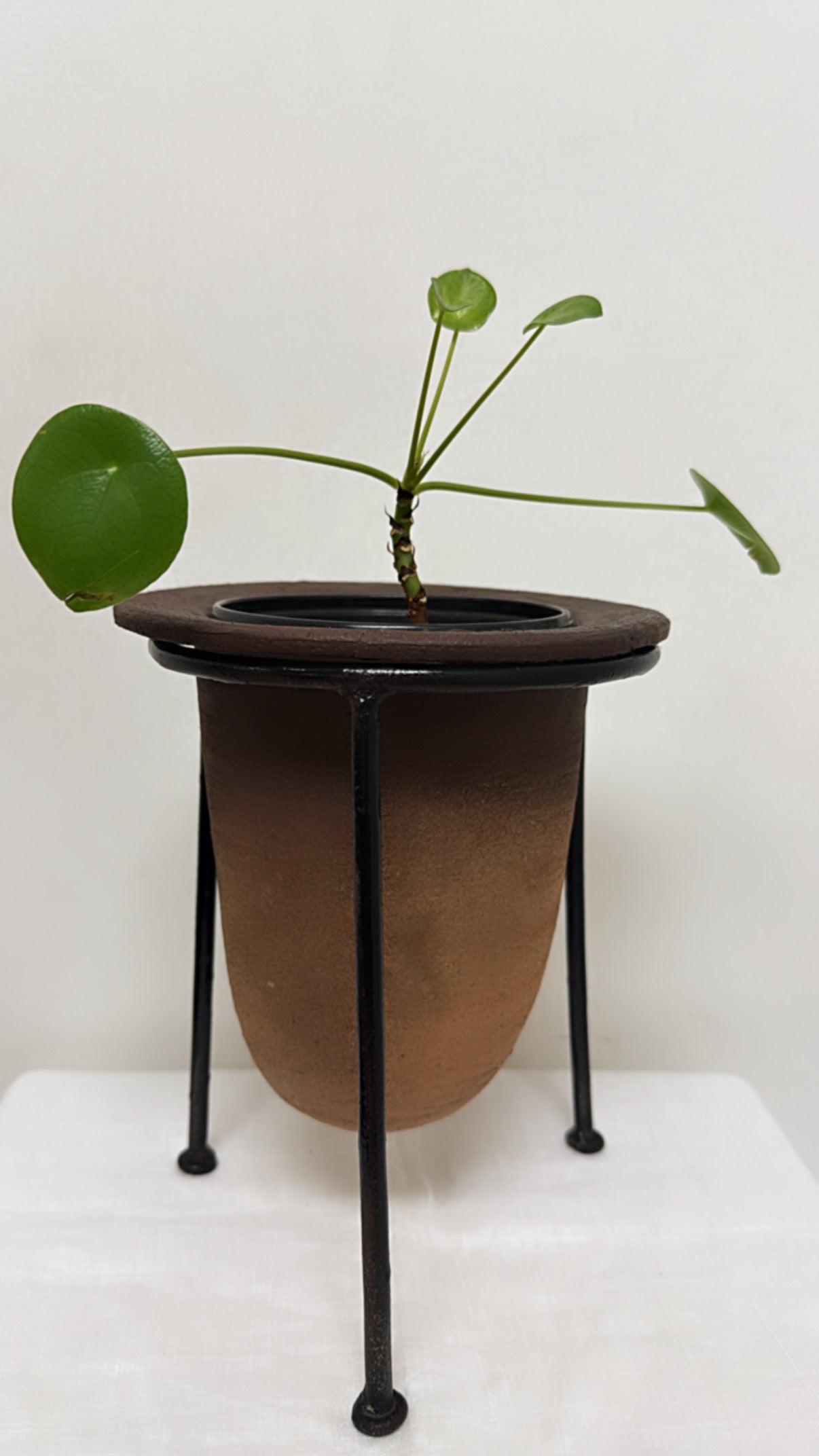 Rustic Terracotta Rounded Bottom Planter with Metal Stand & Pilea Plant