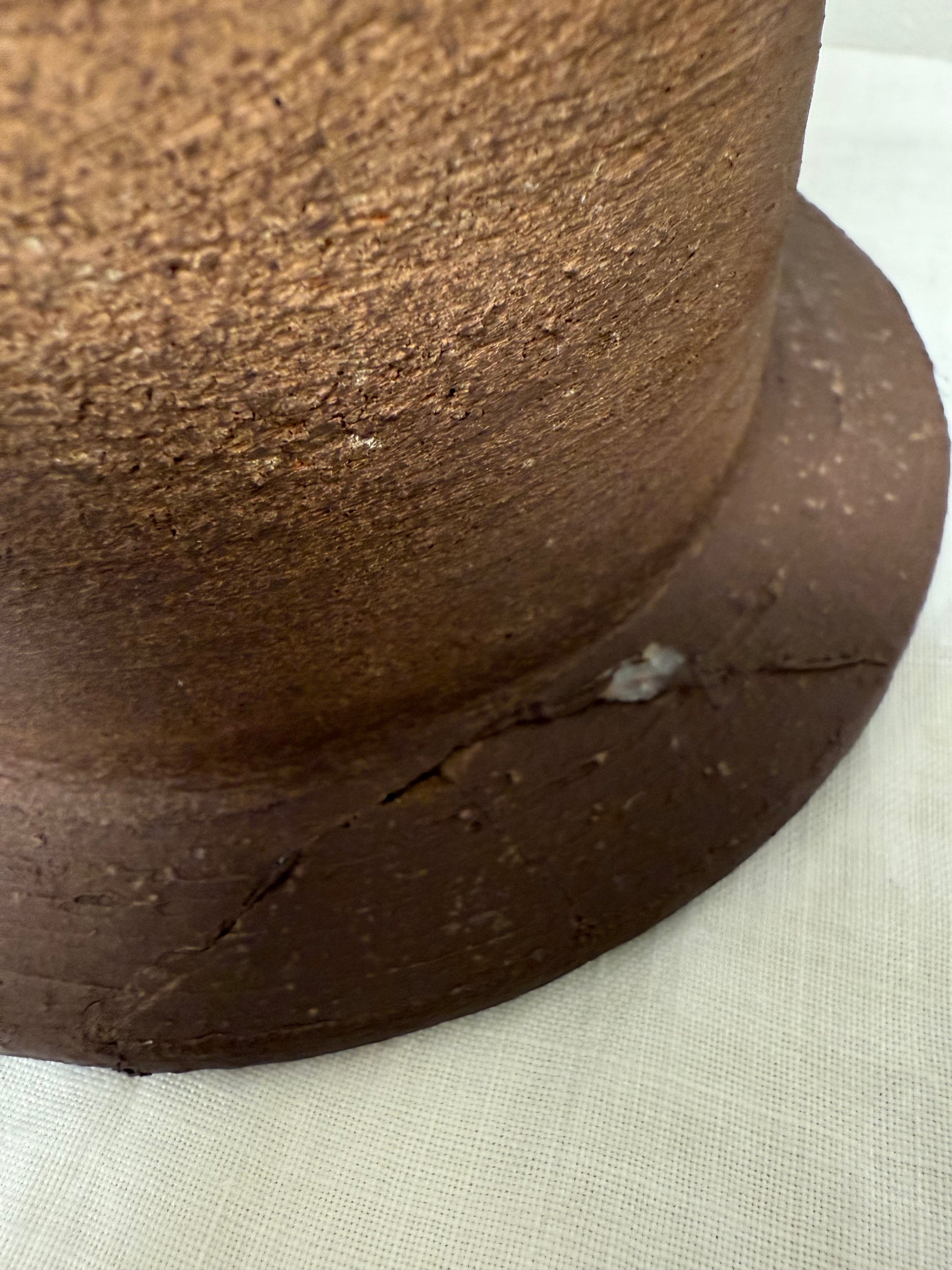 Add charm to your space with this rustic terracotta planter featuring a rounded bottom and a sturdy black metal stand. The planter has a beautiful weathered look and was originally paired at the top (visible rim design). There is a small crack that has been repaired with glue—does not affect stability or function.